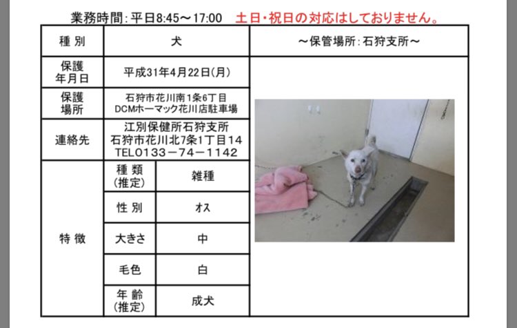 北海道 保健所 里親募集 على تويتر 石狩保健所さん 迷い犬 石狩支所は3わんずが迷子保護されています 柴犬さんはなんと石狩イオン店内で保護されています 2枚目の子は樽川 白ワンはホーマック花川店で保護されています 拡散希望 北海道 保健所 迷い犬
